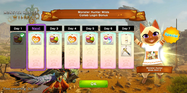 Complete 15 regular, Master, or Event Quests in Monster Hunter Puzzles: Felyne Isles during the events to earn a code that can be redeemed for special rewards in Monster Hunter Wilds!